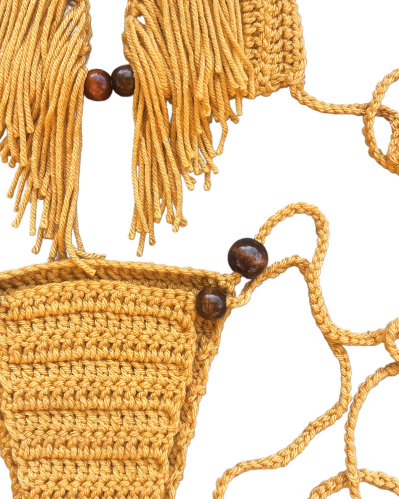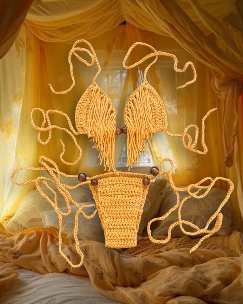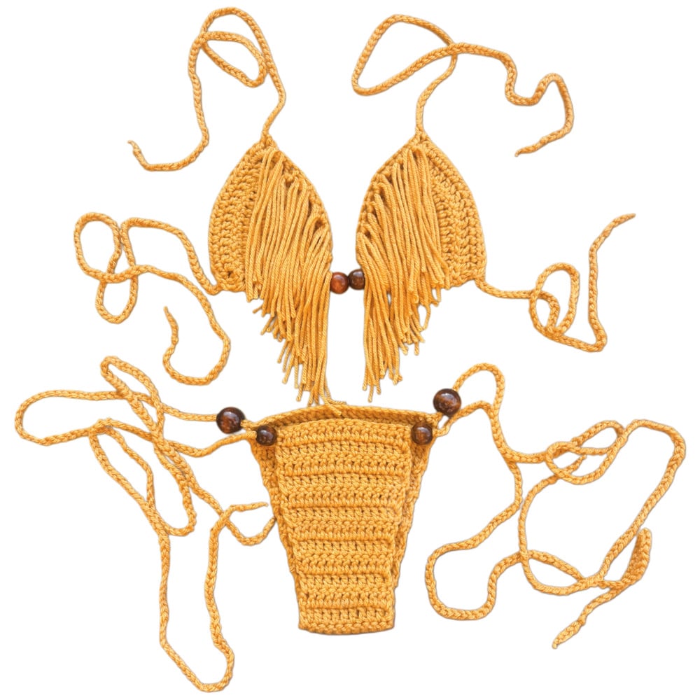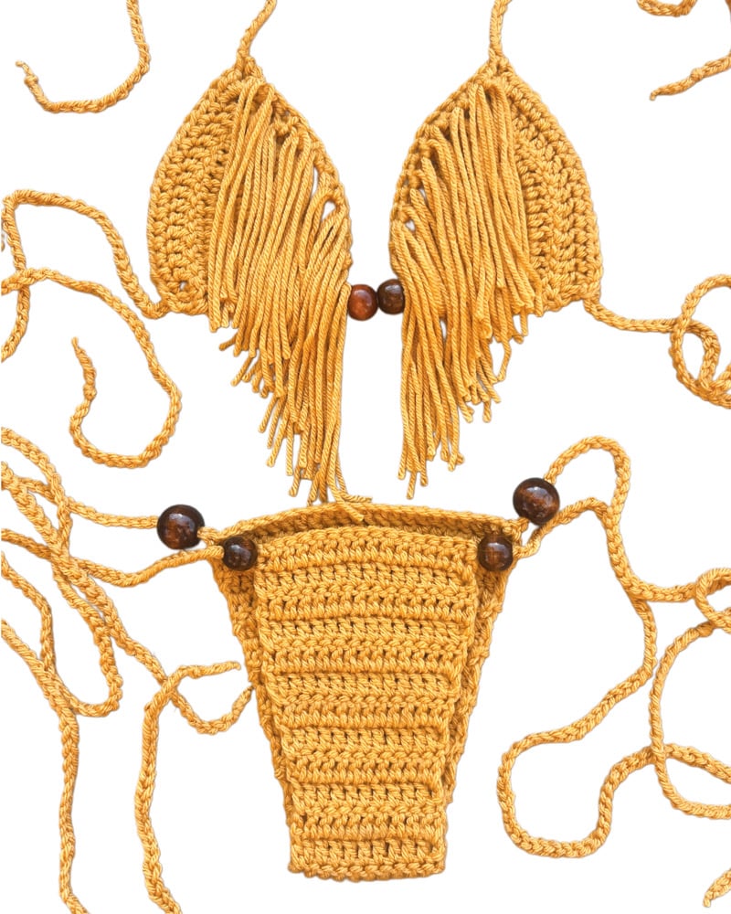 - Cheeky crochet bottoms with adjustable ties to secure your desired fit